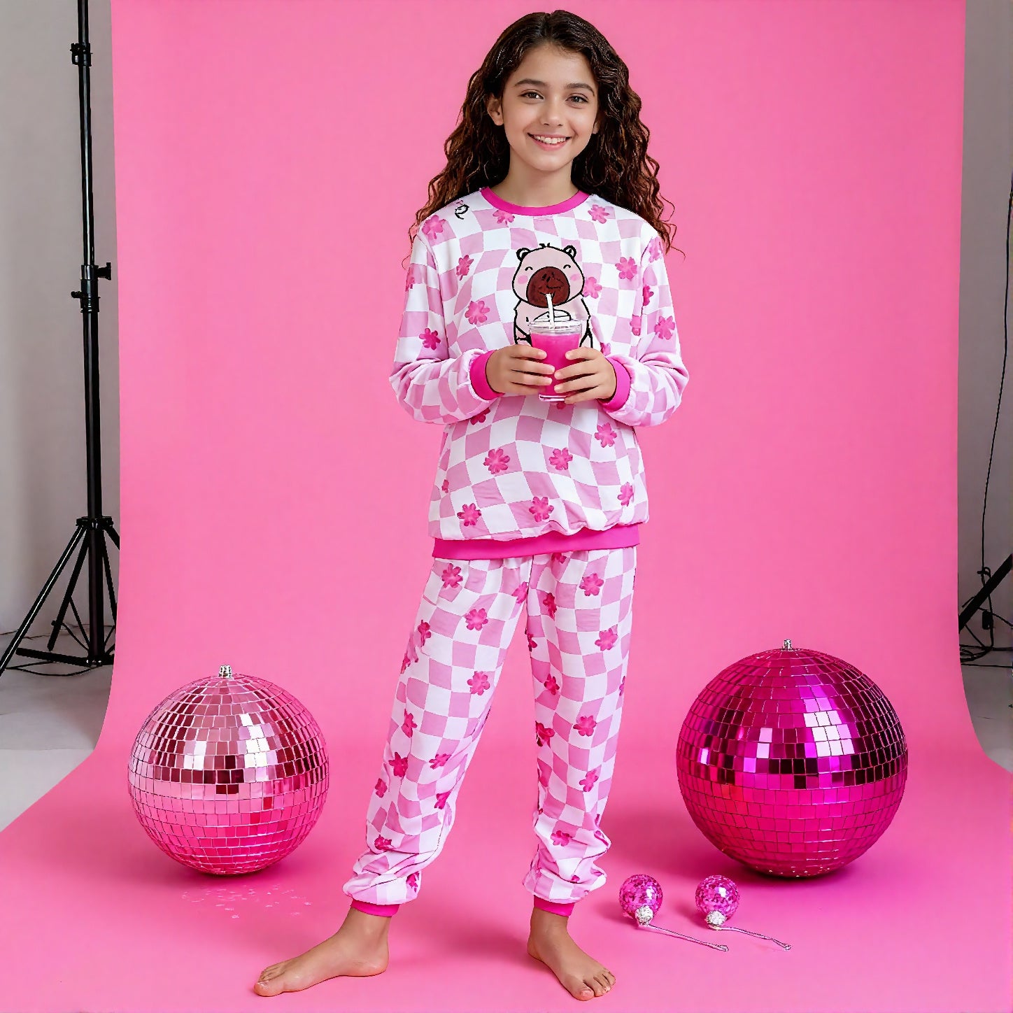 Keep cozy and cute this winter with these Girl's Capybara Fleece Pyjamas. Featuring an adorable capybara design on the front, these pink pyjamas bring fun and warmth to chilly nights. Made from soft fleece, they’re perfect for playful dreamers aged 9 to 12 who want to stay snug while enjoying bedtime adventures.