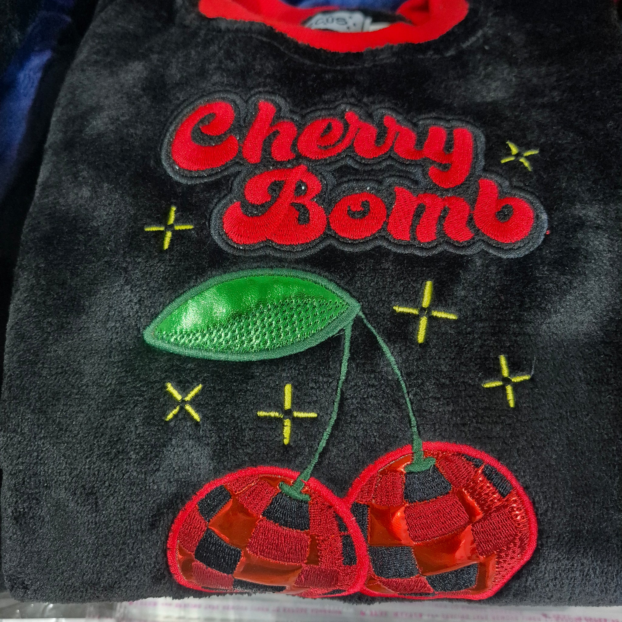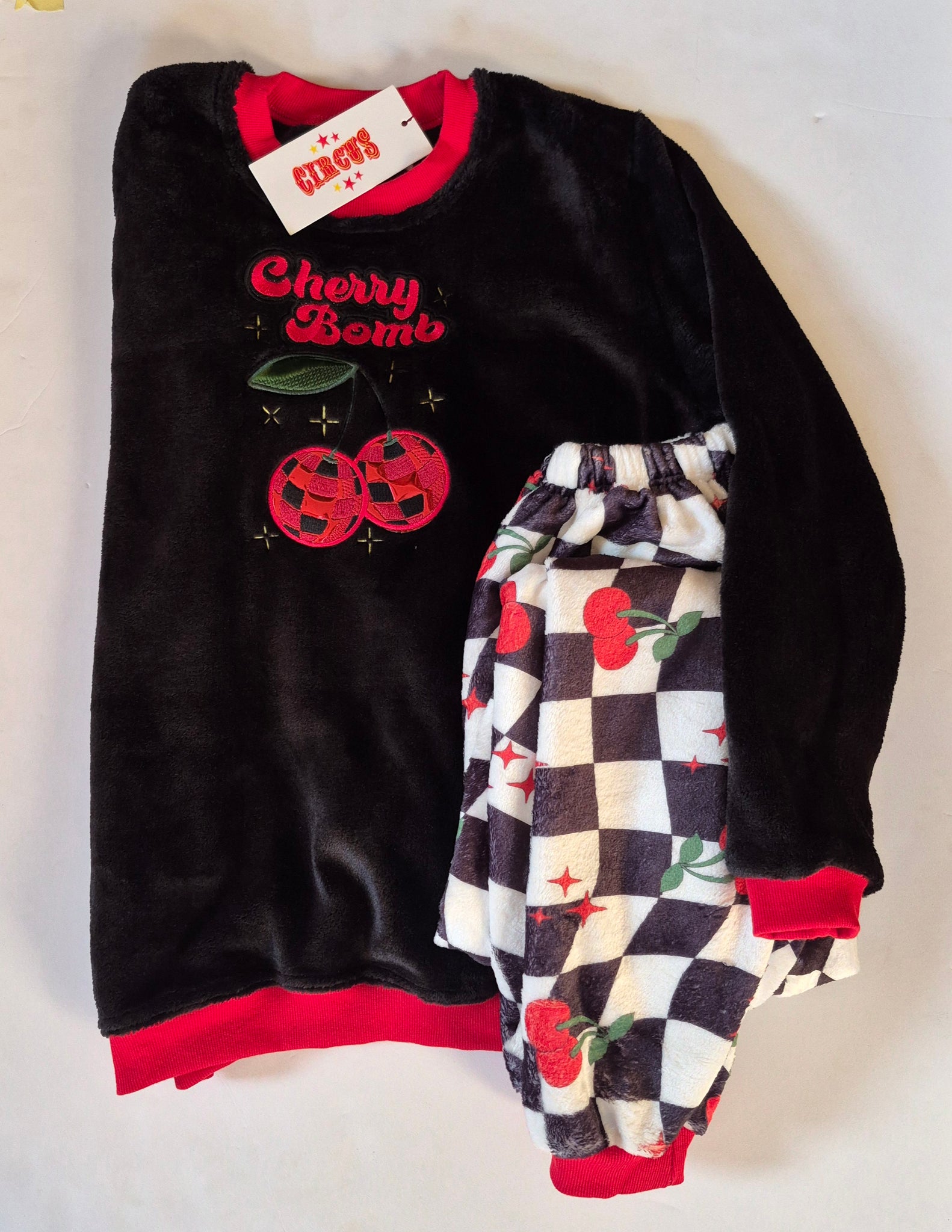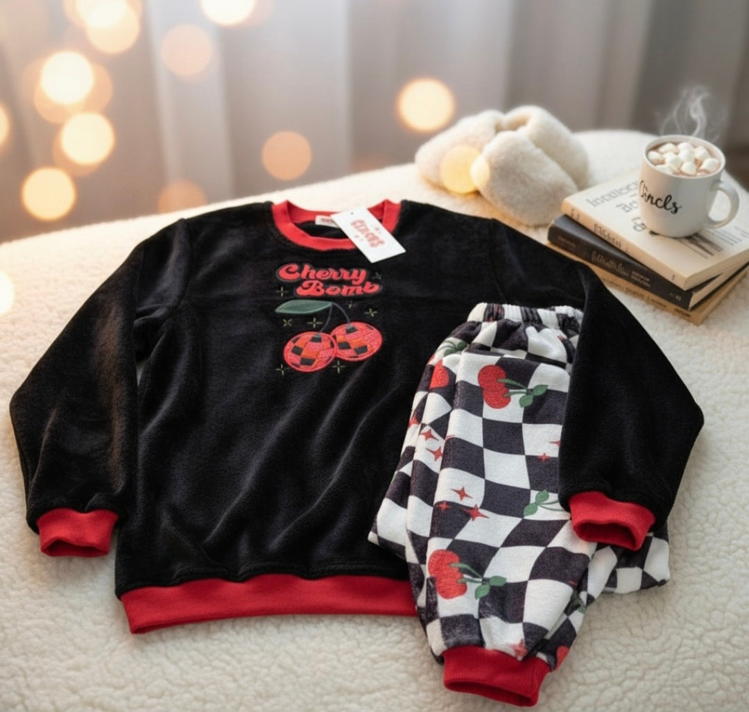 Keep bedtime fun and cozy with these girl's cherry bomb fleece pyjamas. Soft fleece fabric hugs your little one in warmth, while the shiny cherry bomb applique adds a playful pop of sparkle. Perfect for chilly nights, these pyjamas combine comfort with trendy style for ages 7 to 12.