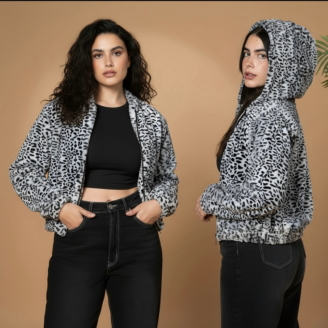 Indulge in luxury with our Women's Black & Grey Fur Leopard Jacket. Embrace the trendy leopard print and stay warm and stylish with its fur fabric and satin interior. Perfect for dressing up or down, this jacket features a hood for a young and chic look. Elevate your style game with this exclusive piece.