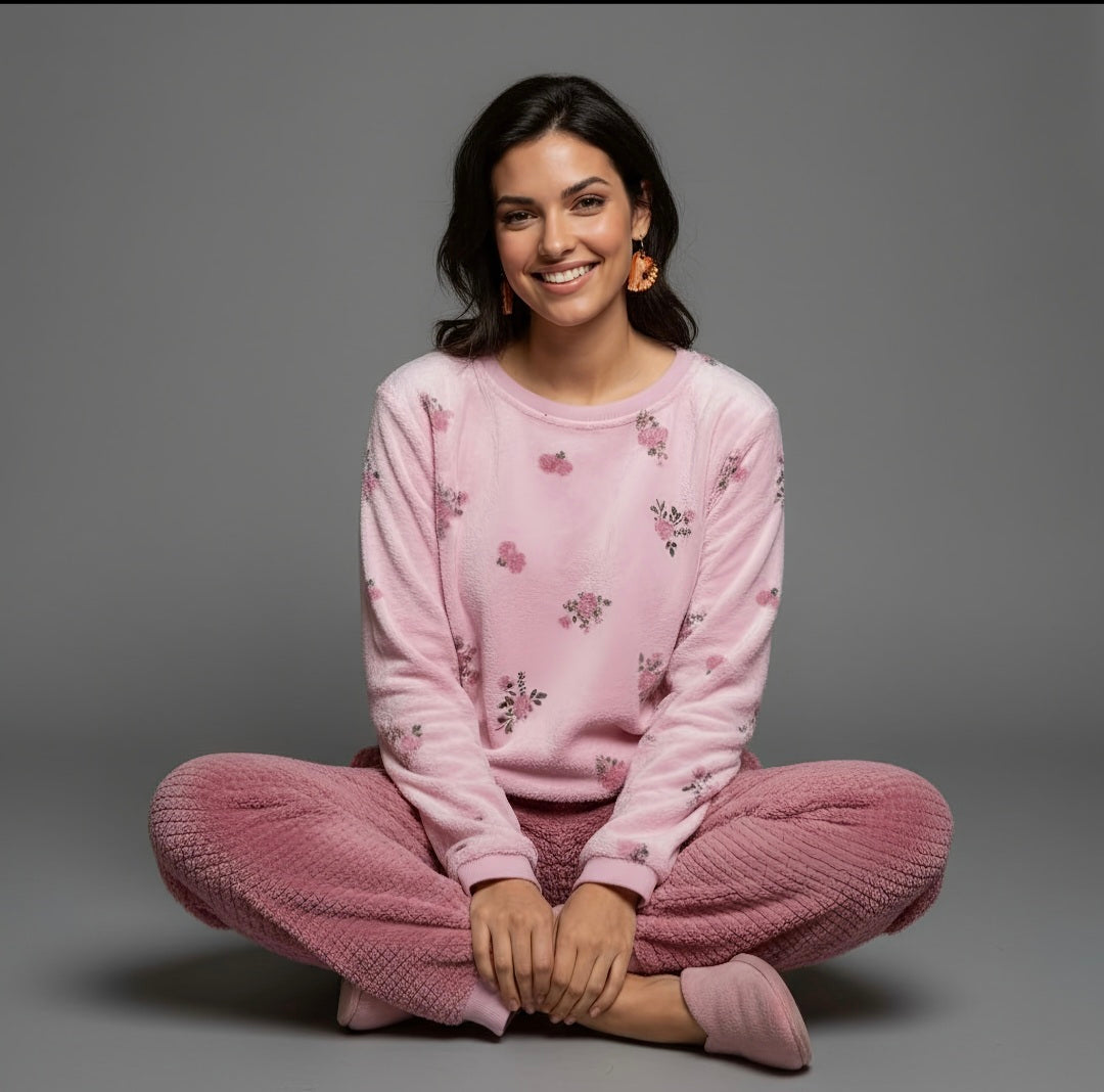 Feel cozy and chic in these Women's Flowers Fleece Pyjamas. The warm fleece top is adorned with charming printed flowers, while the honey-combed pants offer extra comfort and a stylish touch. This classic yet playful set is perfect for relaxing in sophistication, making every night feel special. Available in sizes S to XL.