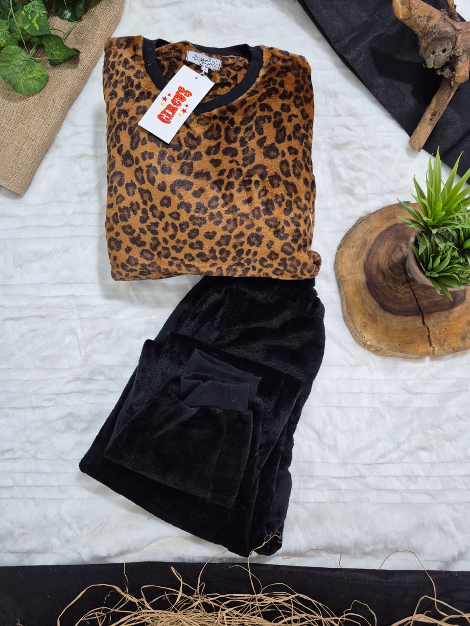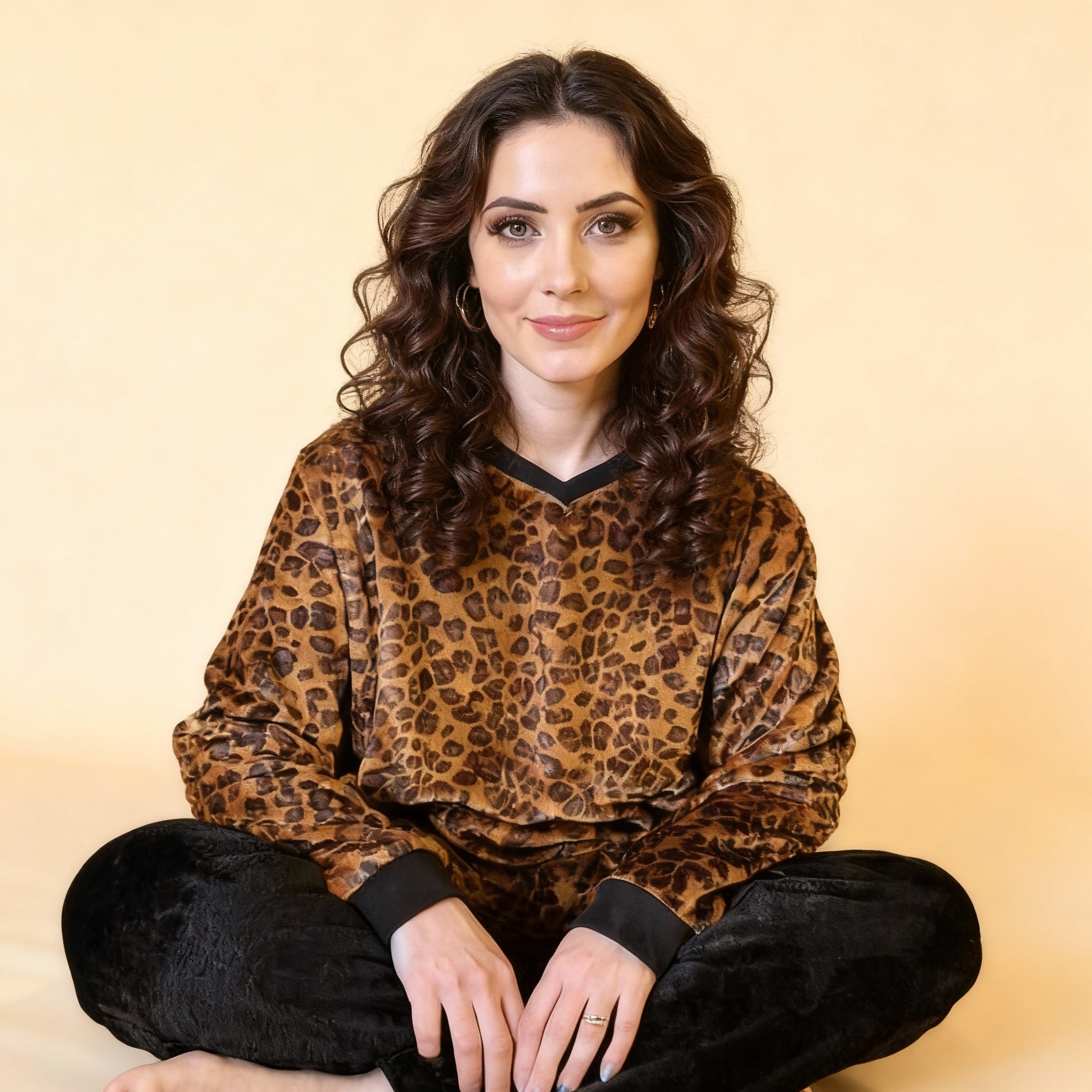 Experience cozy luxury with these Women's Leopard Fleece Pyjamas, designed with a playful twist. The v-neck top features no cuffs at the bottom of the top, giving you freedom to move comfortably, while the loose fit adds to the relaxed vibe. Cuffed pants keep things snug without sacrificing style. Warm and soft fleece makes these pyjamas perfect for lounging, and the elevated leopard print offers a mature, chic look you'll love to wear night after night.